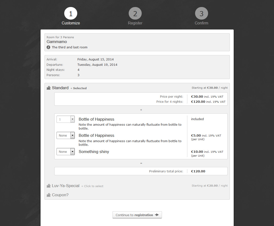 Die Anpassungsseite ermöglicht es dem Gast ein Paket zu wählen (sofern mehrere zur Auswahl stehen) oder ein verstecktes Paket per Gutschein-Code freizuschalten. Zudem kann er die Anzahl an zusätzlich zu buchenden Produkten anpassen.